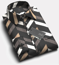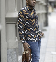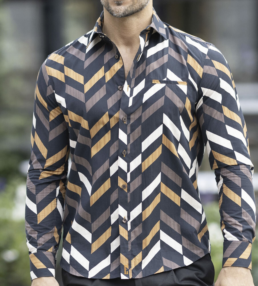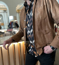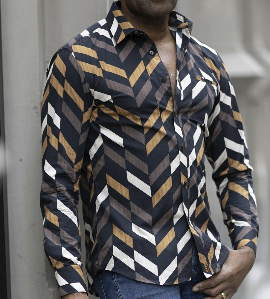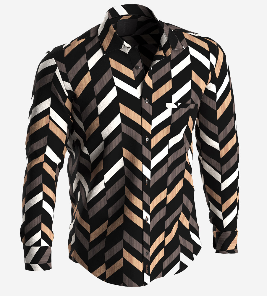 Skjortan har ett storstilat fiskbensmönster i varma bruna toner, vilket ger skjortan karaktär och sin attityd. Skjortans mönster reflekterar ljuset på ett sätt som framhäver tygets djup och karaktär. De pärlemoskimrande knapparna binder samman helheten.