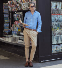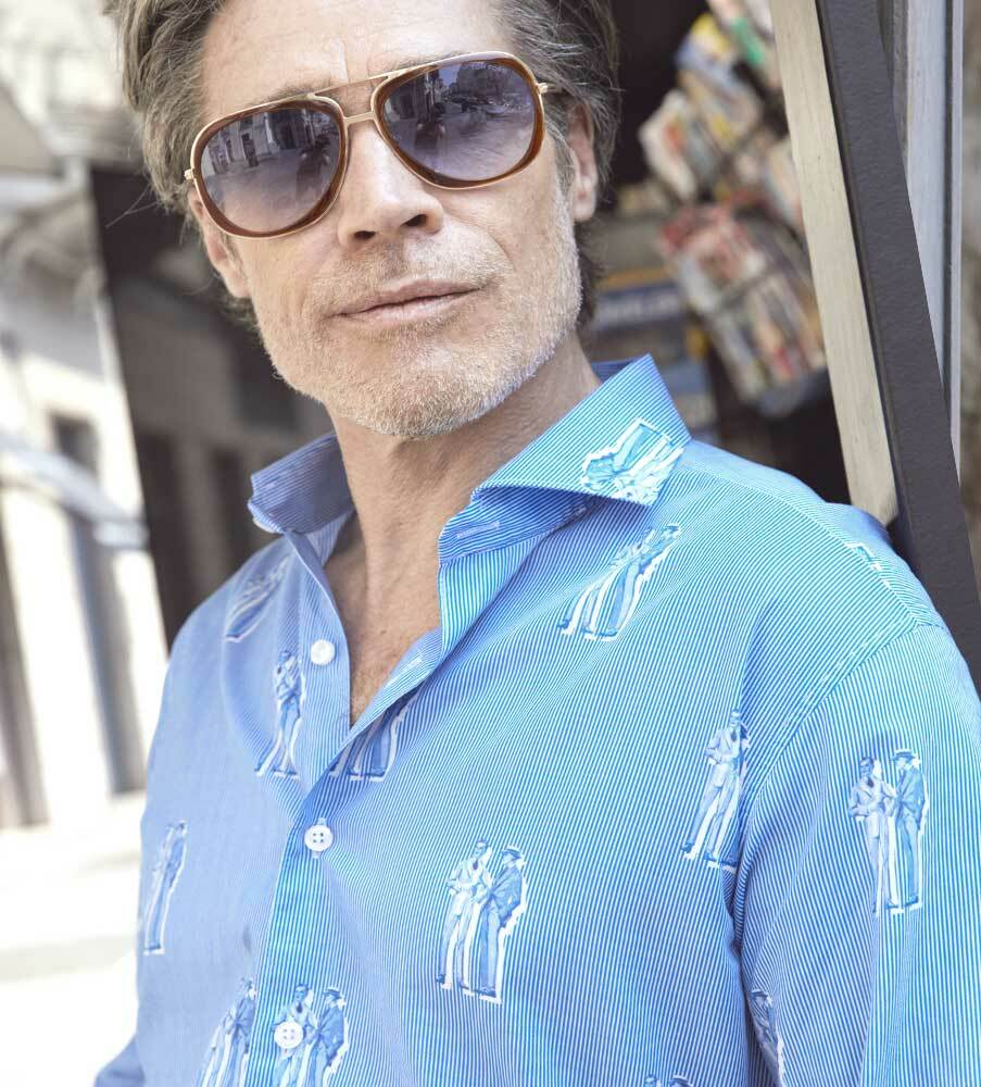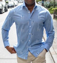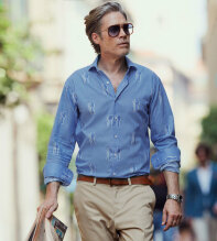 En skjorta i en fantastisk bomullskvalitet som faller bekvämt och manligt på kroppen. Skjortan är smårandig med ett kaxigt tryck. Den blå nyansen ger dig en rejäl attraktionsboost. Skjortan är versatil och passar till bra till avslappnade byxor, som till kostym, jeans, chinos. Skjortan är tillverkad av premiumbomull från ett av våra väverier i Italien och uppsydd i vår sömnadsfabrik vid Östersjön. Det är lätt att se snygg och manlig ut i denna skjorta! Bär den gärna några knappar öppen.