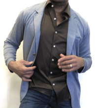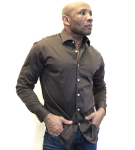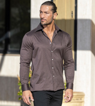 En mörkbrun skjorta i ett fint, följsamt jersey-tyg som ger det bästa av två världar; både komfort och stil. Väven har perfekt lyster och ger fin drapering åt passformen. Tack vare tygkvaliteten får skjortan också en mjuk stretch och skjortan sitter "attraktivt" och bekvämt. Skjortkragen ger bra balans till helheten. Det fina, lätt melerade jerseytyget är Oeko-tex-certifierat och kommer från ett stickeri i Italien och skjortan är uppsydd på 100 mils avstånd, alltså närproducerad.