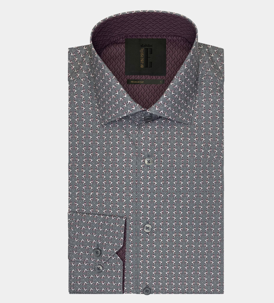 En läcker grå skjorta i fantastisk bomullskvalitet. Tyget kommer från vår italienska vävare och det sublima mönstret ger skjortan ett rejält försprång. Lyxigt vinrött kontrasttyg i nacke och manschett som förhöjer känslan av lyx. Dubbla knapphål för att om så önskas kunna användas med manschettknappar. Snygg ihop med vår Gatsby Cardigan med knapp i flera färger eller med en V-hals merinotröja i fera färger >>. Skjortan finns även uppsydd i en röd variant med insydd ficka. Regular cut, insnitt bak. Kvalitet: 100% bomull Maskintvätt: 40 grader