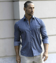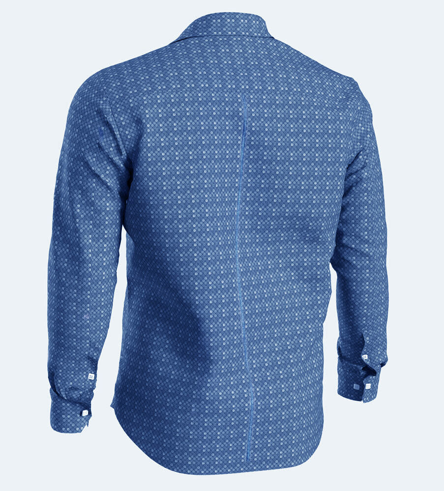 Clean, kaxig och skön. Skjortan i säsongens trendrätta blå nyans är uppsydd i en lyxig satinväv. Några procent elastan ger lätt stretch och hög modegrad. Skjortan har en slimmande detaljrand på ryggen och en blå piping längs med knäppkanten. I kragståndets insida finns en matchande välarbetad kontrastdetalj. Skjortan har också en diskret passpoalficka och manschetternas insida har en snygg insida som visar sig när du väljer att kavla upp ärmen. Knapparna är våra exklusiva logoknappar med klassisk pärlemo finish som bidrar med extra lyster. Tyget är vävt hos ett av Europas äldsta väverier – kvalitet du känner direkt. Alla detaljer ger dig en välarbetad look. Matcha med jeans, chinos eller kostymbyxa. Instoppad för skarpt intryck, utanpå för avslappnat clean. Skjortan är uppsydd på 100 mils avstånd. Skjortan finns i tre färgskalor; ljust tegelbrun skjorta, blå skjorta (denna) samt grön skjorta.