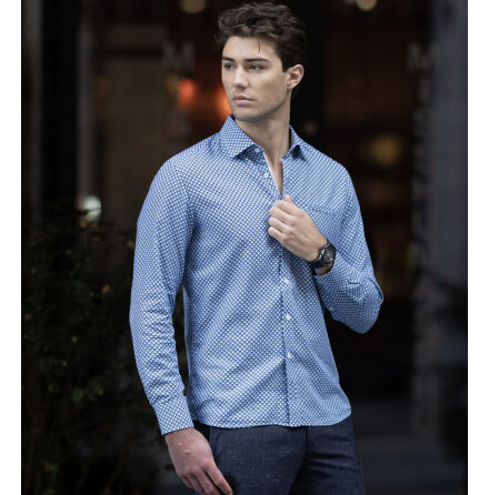 Clean, kaxig och skön. Skjortan i säsongens trendrätta blå nyans är uppsydd i en lyxig satinväv. Några procent elastan ger lätt stretch och hög modegrad. Skjortan har en slimmande detaljrand på ryggen och en blå piping längs med knäppkanten. I kragståndets insida finns en matchande välarbetad kontrastdetalj. Skjortan har också en diskret passpoalficka och manschetternas insida har en snygg insida som visar sig när du väljer att kavla upp ärmen. Knapparna är våra exklusiva logoknappar med klassisk pärlemo finish som bidrar med extra lyster. Tyget är vävt hos ett av Europas äldsta väverier – kvalitet du känner direkt. Alla detaljer ger dig en välarbetad look. Matcha med jeans, chinos eller kostymbyxa. Instoppad för skarpt intryck, utanpå för avslappnat clean. Skjortan är uppsydd på 100 mils avstånd. Skjortan finns i tre färgskalor; ljust tegelbrun skjorta, blå skjorta (denna) samt grön skjorta.