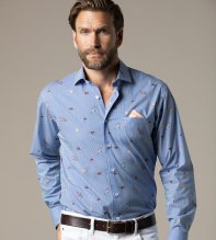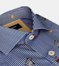 En skön skjorta i exklusiv bomull. Skjorttyget pryds av ett ett förtrollande print på en blå och vit randig bas. Skjortan har en Cut Away Krage och en diskret bröstficka med infälld näsduk. Om du vill kan du dra upp fickpåsen för en dressad look alternativt dölja den totalt. 97% bomull 3% elastan ger din skjorta naturlig stretch som kräver minimalt underhåll och ger skjortan en snygg look. Skjortan blir snygg med snyggt bältade kostymbyxor, vita jeans eller blå jeans. Skjortan är snygg med en blå tröja eller kavaj. Tvättråd: 40 grader maskintvätt.