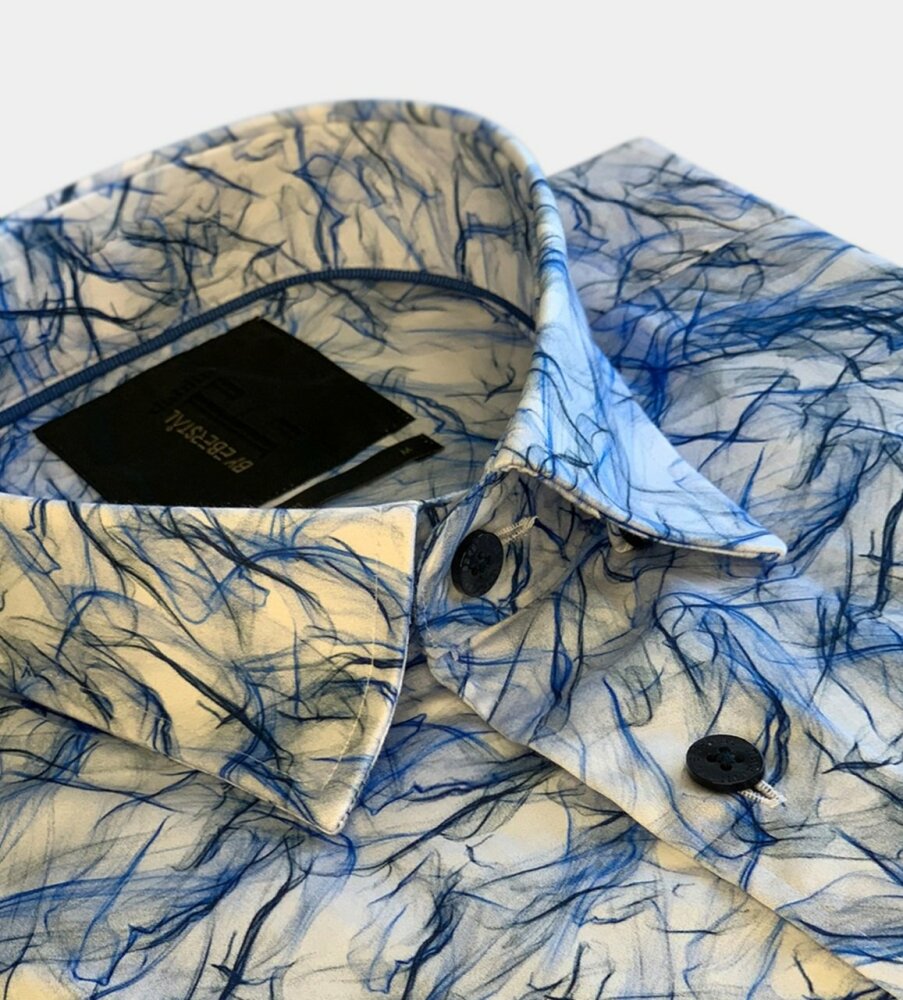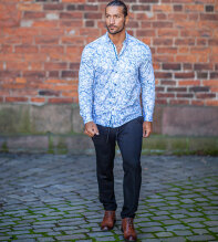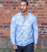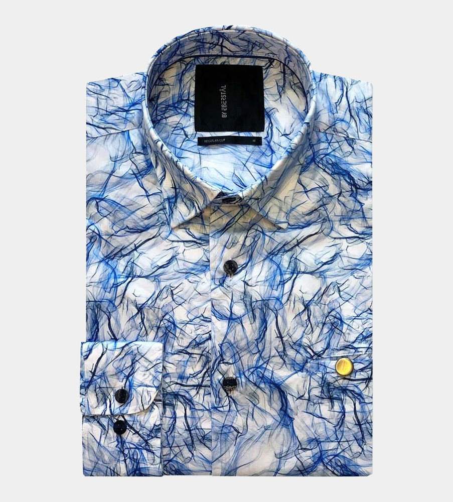 En skjorta i vår Regular-cut passform med ett tryckt blått mönster med fjäderlätt känsla. Bomullstyget i den här skjortan har skön silkeslen känsla mot huden. På inre knappslåt finns ett blått dekorband. Mörkblå Dahlin by Eberstål -knappar och ett broderat E på manschetten signerar denna kvalitetsskjorta. Skjortan har ok och insnitt i ryggen vilket ger en snygg passform.