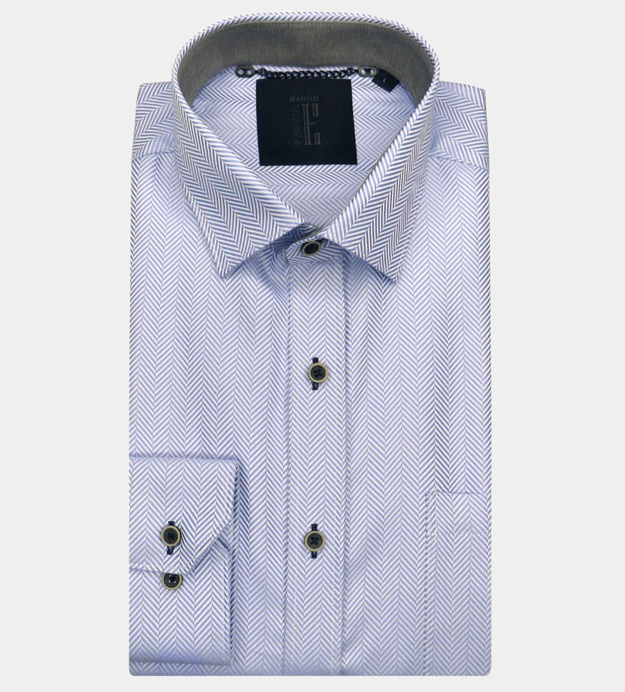 En hybrid skjorta med dragkedja för dig som vill att det ska gå riktigt snabbt att ta på, och av, skjortan. På denna skjorta är knapparna enbart för dekoration. Det lyxiga blå tyget är jaquardvävt i Tjeckien och uppfyller många fina miljömärkningar för att inte tala om den vackra lystern och mönstret i väven. En skjorta för dig som gillar detaljer.