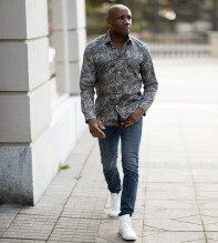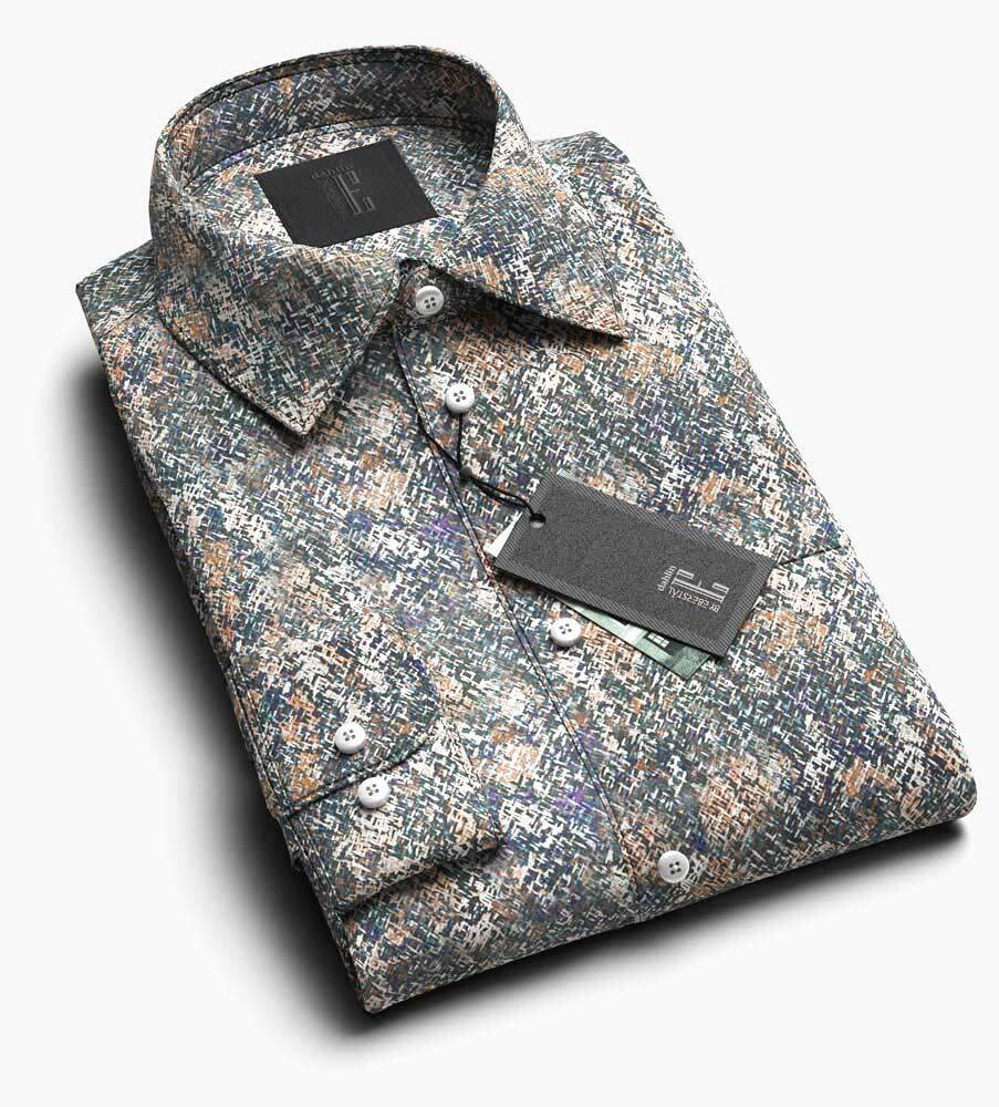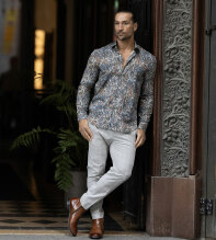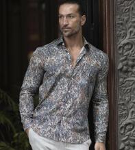 En exklusiv skjorta med lätt stretch som ger en följsam passform och en skarp, välbalanserad silhuett. Det sofistikerade mönstret i bruna och blå nyanser mot en ren vit bas skapar ett uttryck som både känns kraftfullt och fräscht.