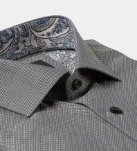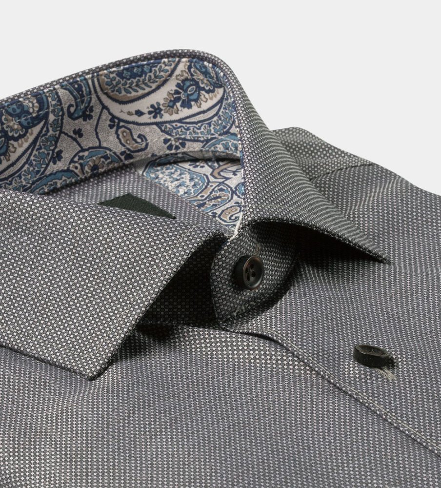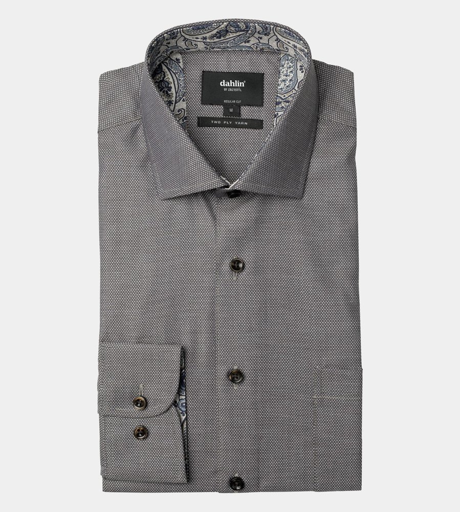 Bomullsskjorta i en snygg textur som ger ett tvåfärgat uttryck. Med ett lekfullt paisleymönster i krage och manschett får du en skjorta som är klassisk men samtidigt intressant. Skjortan har en cut away krage samt praktisk bröstficka. Perfekt för basgarderoben. Maskintvätt 40°