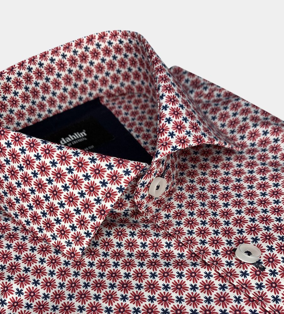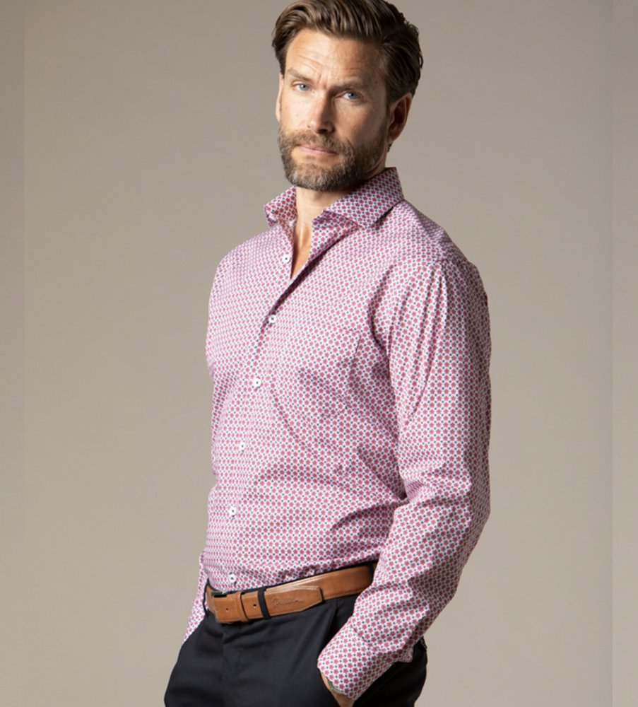 En mikromönstrad långtärmad skjorta med diskreta detaljer i röd färgskala. Det är inte förrän du kommer närmre som du ser skönheten i detaljerna. Skjortan har röda och svarta symboler som representerar solen och stjärnor i universum.
