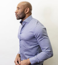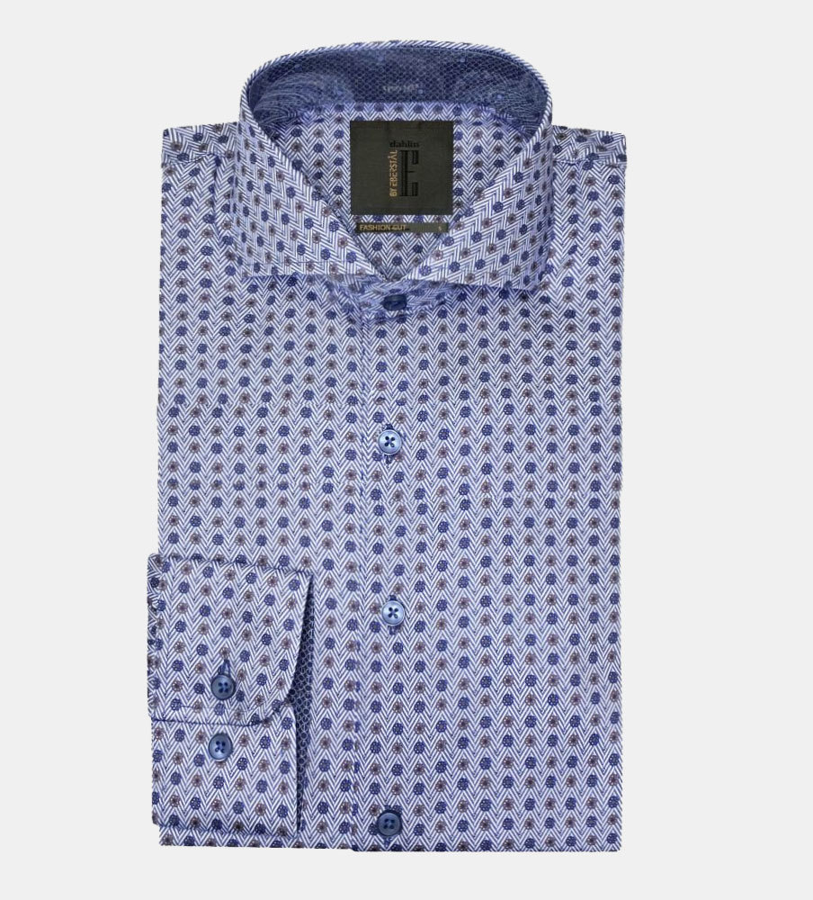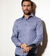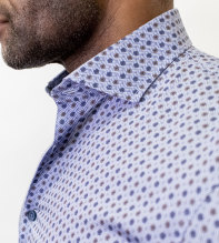 Snygg herrskjorta i skönaste bomull. Tyget är fiskbens-mönstrat i vitt och blått med små blå och bruna blommor. Skjortan har ett kontrasttyg i nacke och manschett. Ett par kontrastknappar förhöjer skjortans karaktär ytterligare. En klassisk skjorta i modern tappning som är lätt att matcha till de flesta byxor. Fashion cut med cut away krage och insnitt i ryggen för perfekt passform. Kvalitet: 100% bomull. Maskintvätt: 40 grader