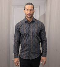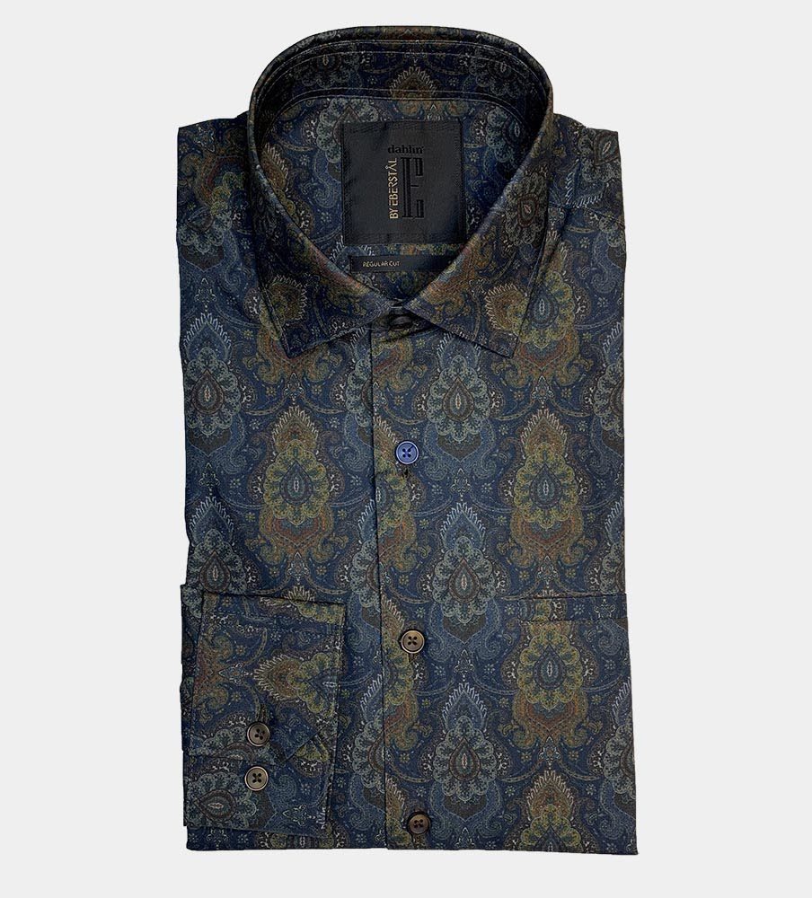 Vår nya skjorta med print av klassiskt medaljongmotiv är uppsydd i en skön bomullskvalitet från vårt italienska väveri. Skjortan har vår uppskattade E-cut med en snygg, modern krage. Skjortan har en passpoalficka på bröstet, knappar i brunt och dubbla knapphål på manschetten. En kontrastknapp i blått sitter under första knappen. Denna mörkblå paisley skjorta i blå nyanser sågs i veckan på Fredrik Lindström i På spåret i SVT, Sveriges Televison.
