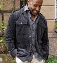 En skön manchesterjacka i ett mjukt, bredrandigt manchestertyg. En grå manchesterjacka som passar fint till olika årstider och fint till många av våra skjortor. en praktisk och snygg jacka med två bröstfickor med ficklock och knapp, plus två påsydda fickor nedantill. Jackan har dekorativa straps på axeln med knappfastsättning, ok och lockerloop på ryggen. Ett broderat E pryder knappslån nertill. Grå, mjuk ock skön! Jackan är uppsydd i 97% bomull och 3% elastan med fina miljömärkningar, uppsydd på 100 mils avstånd, dvs. närproducerad.